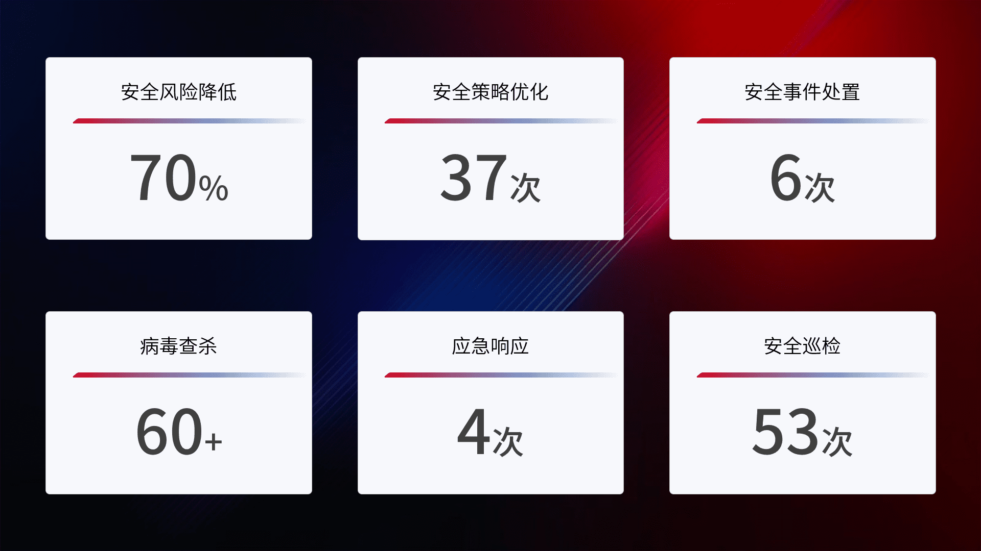 提供全面的安全事件报告体系,,包括处置报告、、、周报、、、、季度和年度总结,,,结合持续监控,,帮助客户深入了解网络安全状况。。。。