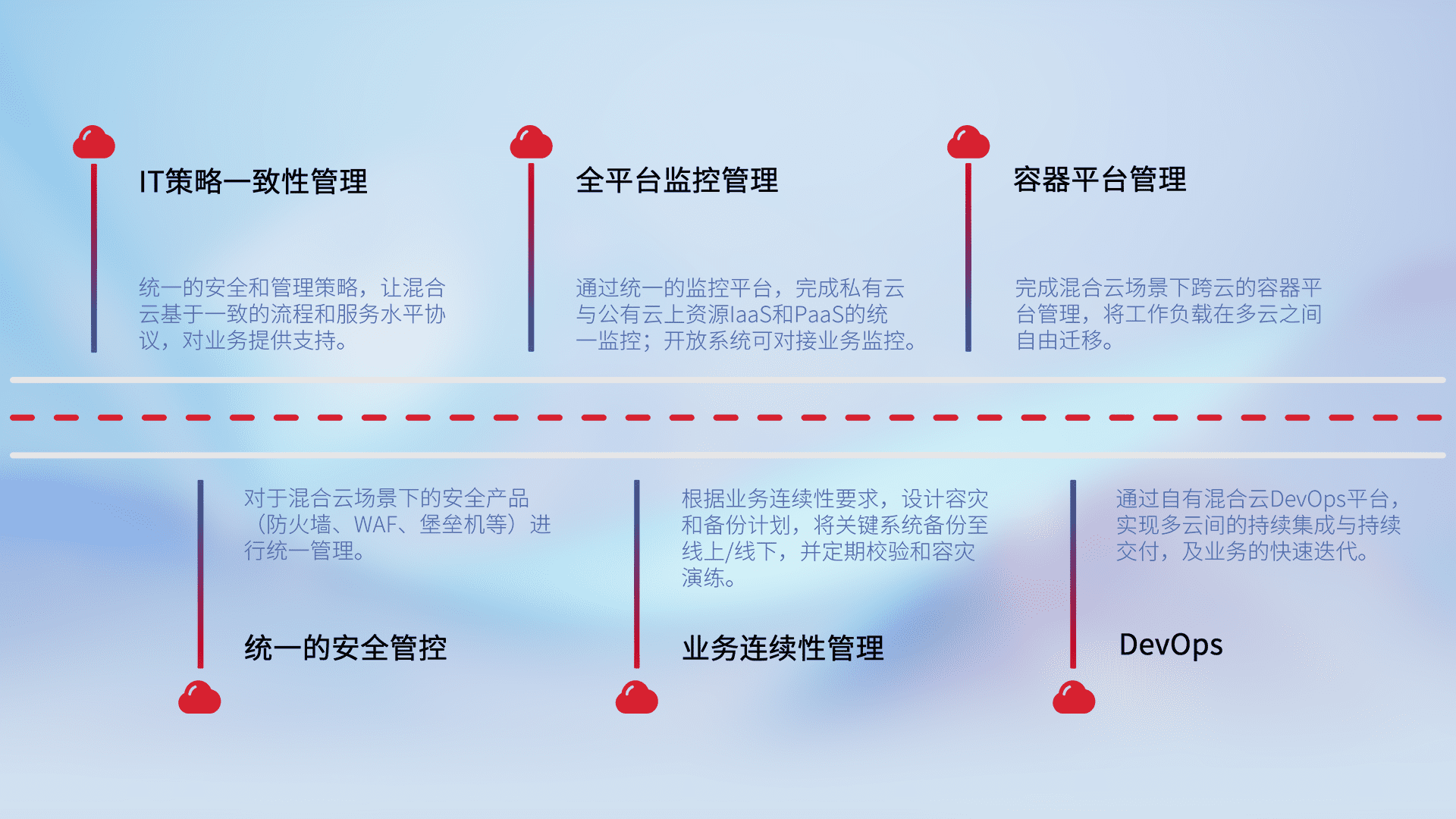 通过多云纳管,,以统一的资源数据模型把客户的云资源进行抽象和封装,,进而实现对多云资源的统一操作,,,,保障云资源管理的可靠性、、稳定性与可用性。。。。量身定制化运维内容,,,,配置、、、、开发运维、、、、补丁管理、、备份、、、、监控、、、、认证和访问管理、、、、审计和日常巡检等,,保障在用云过程中的可靠度,,,,稳定度以及高可用率。。。。